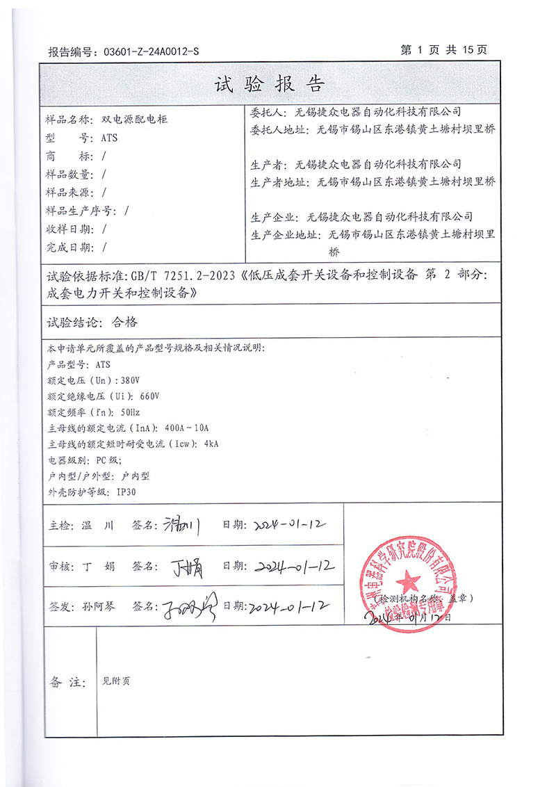 ATS雙電源配電柜 試驗(yàn)報(bào)告1