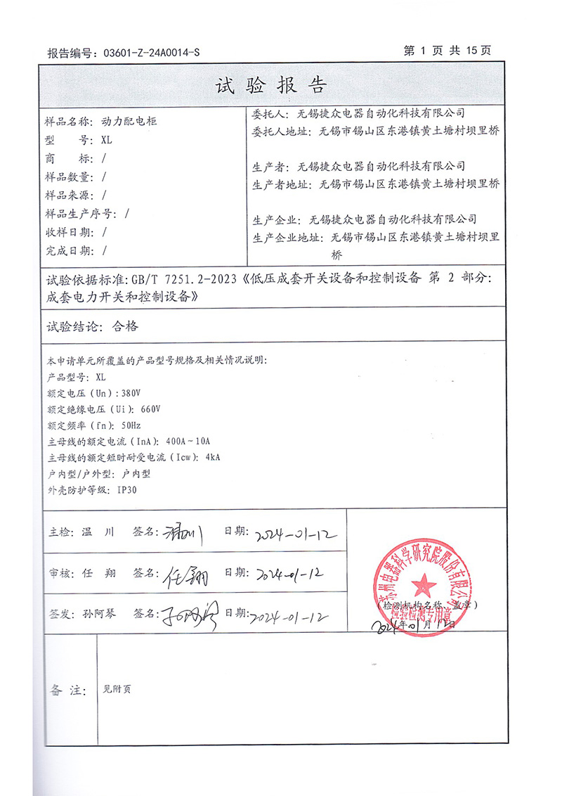 XL動(dòng)力配電柜 試驗(yàn)報(bào)告2